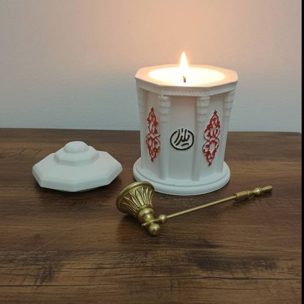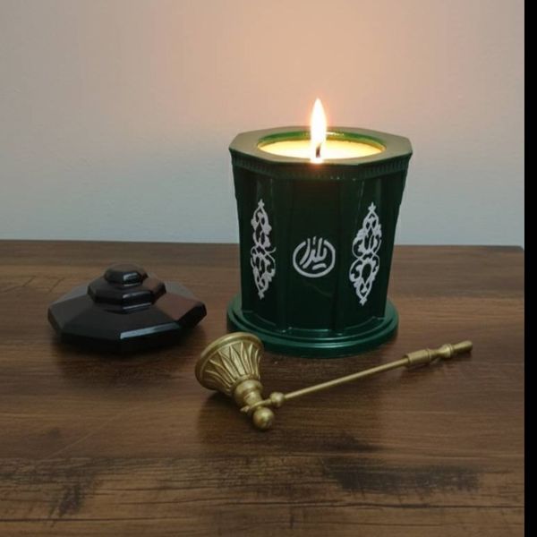 نقوش مذهبی/عرفانی: وجود نمادها یا خطاطی‌های مذهبی/عرفانی (مانند اشعار یا اسامی متبرکه) بر روی بدنه، به این شمع جلوه‌ای فاخر و متبرک بخشیده است.