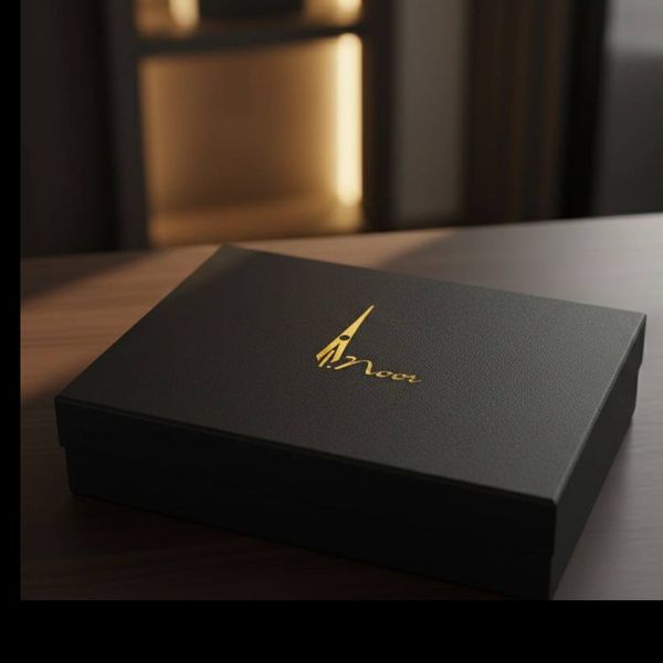 * جعبه هدیه مشکی (لوگوی آی نور): محصولات درون یک جعبه هدیه مگنتی (آهنربایی) مشکی مات قرار گرفتهاند که لوگوی طلایی "آی نور" بر روی آن حک شده است. این بستهبندی، سادگی و لوکس بودن را به اوج رسانده است.